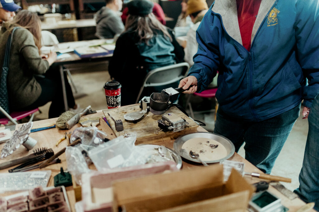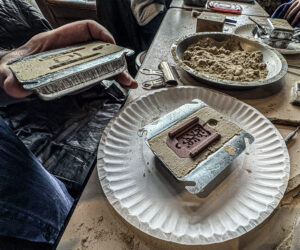 Portable micro-foundry workshops teaching sand mold making and tin casting in a comfortably small, classroom setting from start to finish within an hour.